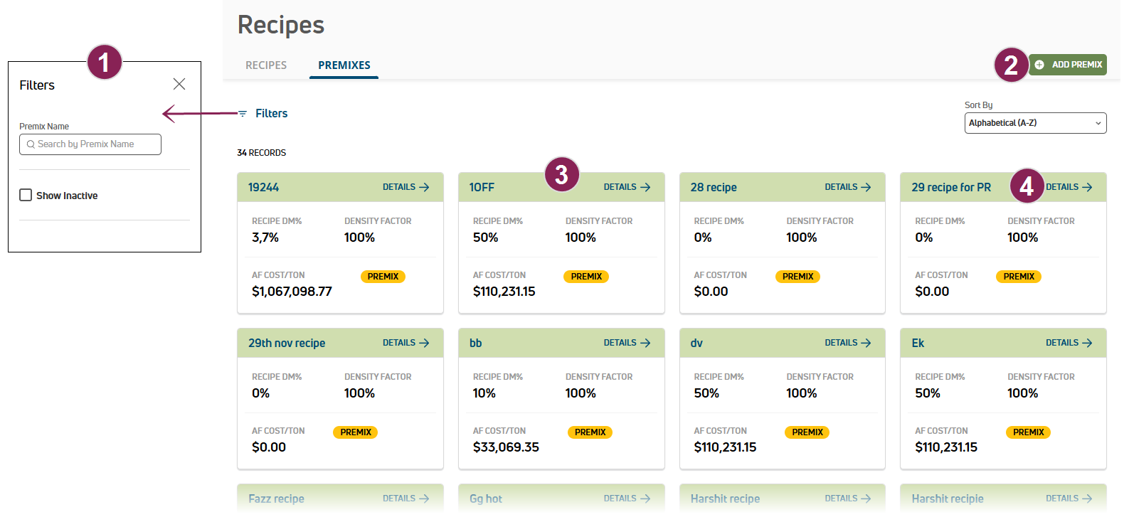 At the top left of the page, click the Recipes tab to view all available recipesClosed A combination of ingredients used to make feed for animals in FeedComp. Or, click the Premixes tab to view all available premixes. Expand the sections below to learn more:
