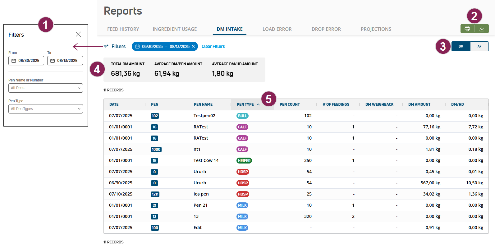Use the DM Intake report to view dry matterClosed The dry weight of an ingredient with no mositure (DM) and as-fed (AF) amounts delivered to the pens at your dairy.