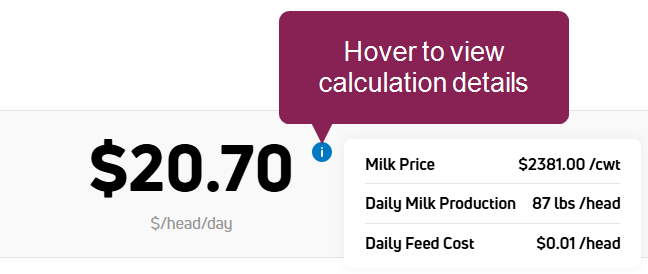 To view the current milk price being used for the IOFC calculation, hover over the info icon next to the IOFC value :