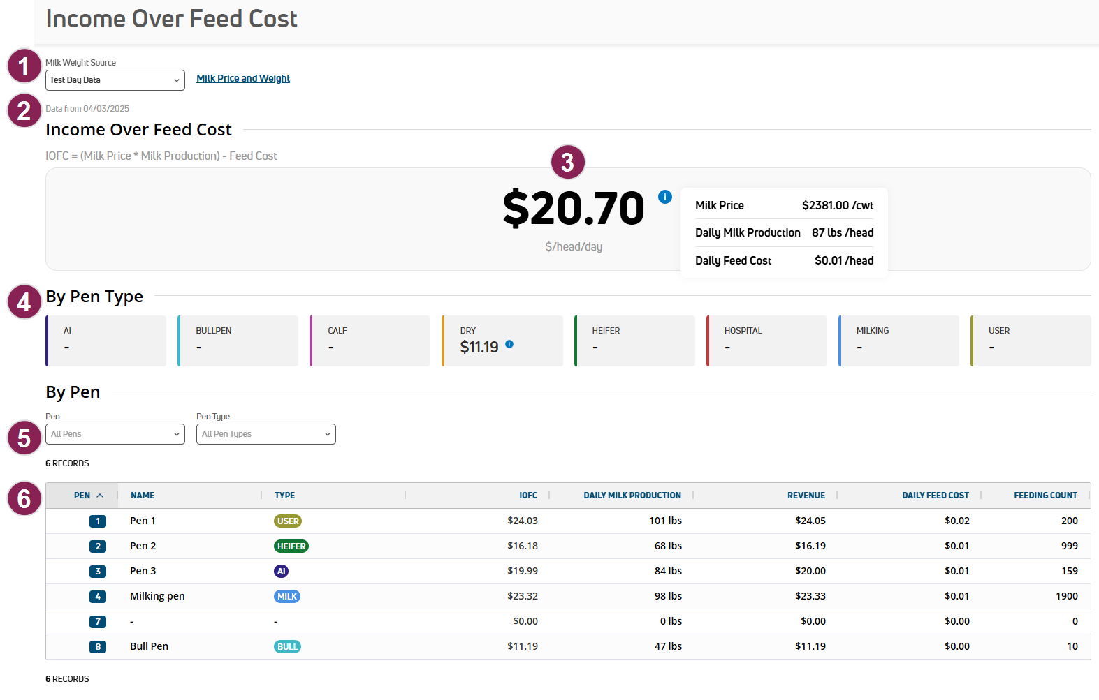 7. IOFC by Pen: View feed cost and milk production details in a table format:
