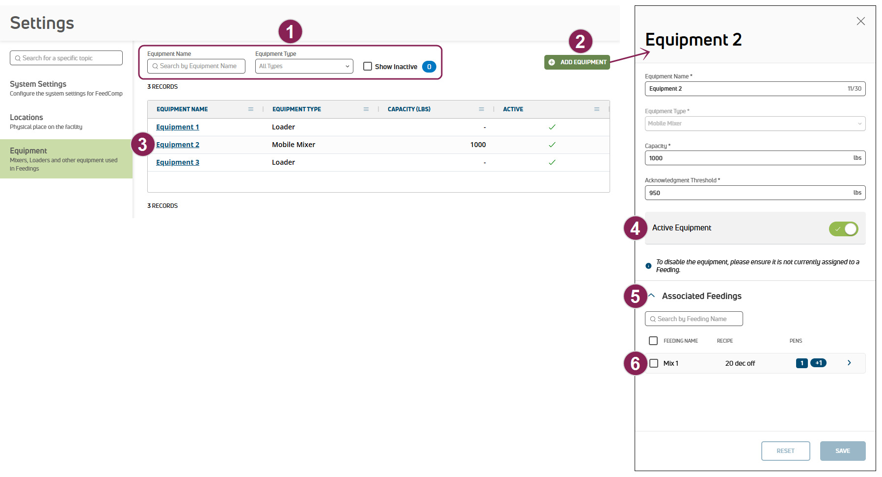 TIP: You're currently viewing online help for equipment in FeedComp on PULSE. Click here to see online help for equipment in the FeedComp mobile app.