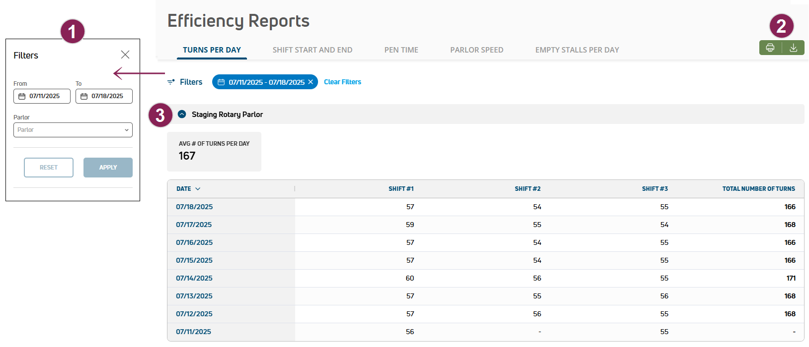 Use the Turns per Day report to review and analyze the number of times the parlor rotated at your dairy by parlor, date, and shift. This information can help you review your management strategies to improve efficiencies for specific parlors, shifts, or pens.