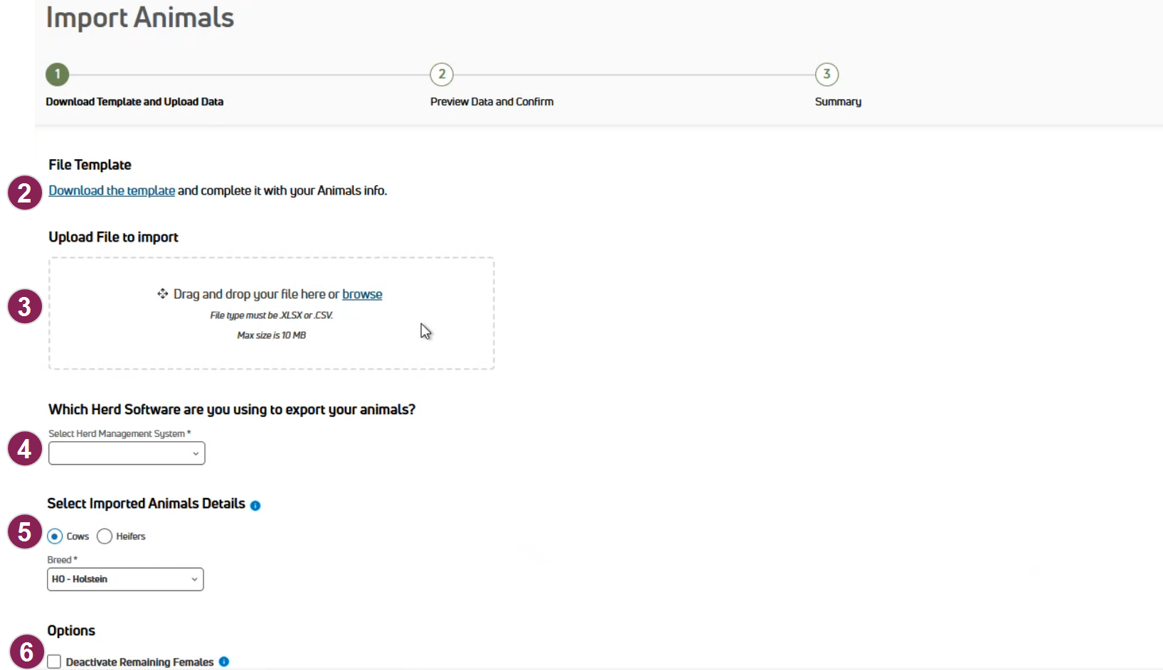 Follow the steps below to import multiple animals from your third-party herd management system: